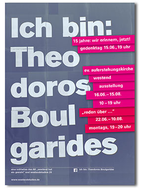 am 15.06. findet zum 15. todestag von theodoros boulgarides an der trappentreustraße eine kranzniederlegung statt, mit anschließender gedenkfeier in der evangelischen auferstehungskirche westend. dabei wird die installation „ich bin: theodoros boulgarides“ von wolfgang gebhard gezeigt, die auch an weitere opfer rechtsextremer gewalt erinnert. helga seewann präsentiert in einem video ihren trauertanz von 2014 (st. paul) für boulgarides. manuela serafim, griechisch-deutsche liedermacherin, bringt ihre eigens geschriebenen lieder dar. im anschluss gibt es ein interkonfessionelles gebet.